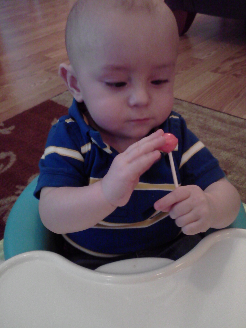 | Checking out his dum-dum sucker, as directed by his feeding therapist |